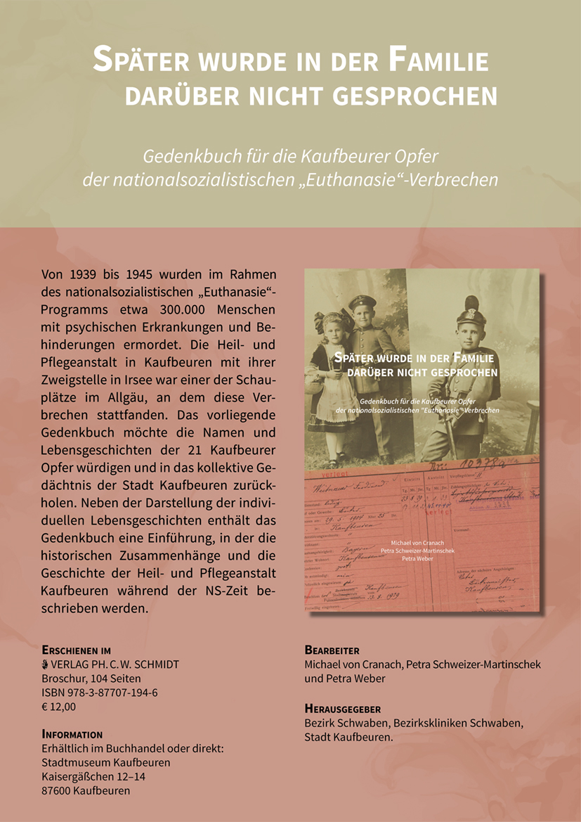 Am Freitag, den 18.12.2020, wird das Gedenkbuch für die Kaufbeurer Opfer der nationalsozialistischen „Euthanasie“-Verbrechen mit dem Titel „Später wurde in der Familie darüber nicht gesprochen“ der Öffentlichkeit vorgestellt. Es ist eines der vielen Nachfolgeprojekte der Sonderausstellung „Kaufbeuren unterm Hakenkreuz. Eine Stadt geht auf Spurensuche“, die diesen Sommer zu Ende ging.