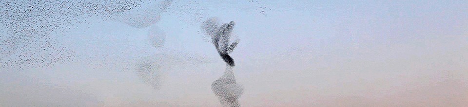 Christoph Brech: riesige Staren-Schwärme kreisen am Abendhimmel. Der Himmel ist oben hellblau verfärbt und geht unten in ein warmes rot/violett über.Schwärme von tausenden von Staren kreisen am Abendhimmel über Rom.