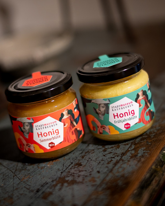 Seit Frühjahr 2023 kooperiert das Stadtmuseum Kaufbeuren mit der Bio-Imkerei Immenstube, die von Philip Loos betrieben wird. Ab sofort ist im Museumsshop sowohl die Frühjahrs- als auch die Sommerblütenhonig der Museumsbienen erhältlich. Schon im dritten Jahr haben zwei Bienenvölker der Immenstube ihr Zuhause auf der Dachterrasse des Stadtmuseums Kaufbeuren gefunden. Die Bienen können ausgehend vom Museum vielfältige Futterquellen in der Innenstadt finden. Weitere Informationen finden Sie hier.