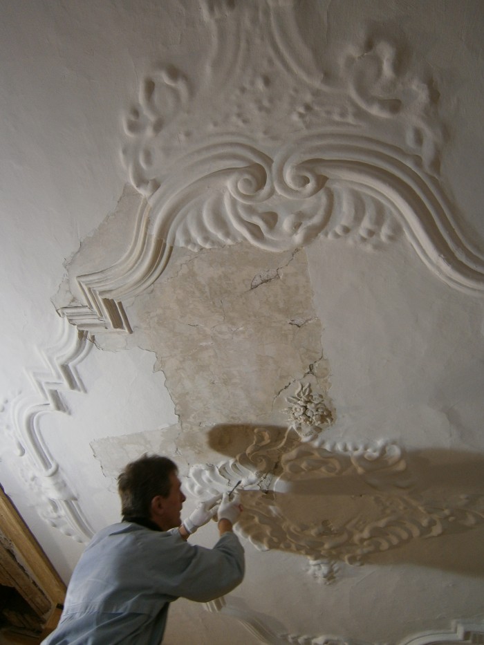 ... legt Herr Haug Ende Oktober den feinen Stuck im 1. Obergeschoss des alten Museumsgebäudes frei. Unter einer dicken Schicht aus Putz und Farbe kommen filigrane Blumenornamente zum Vorschein.