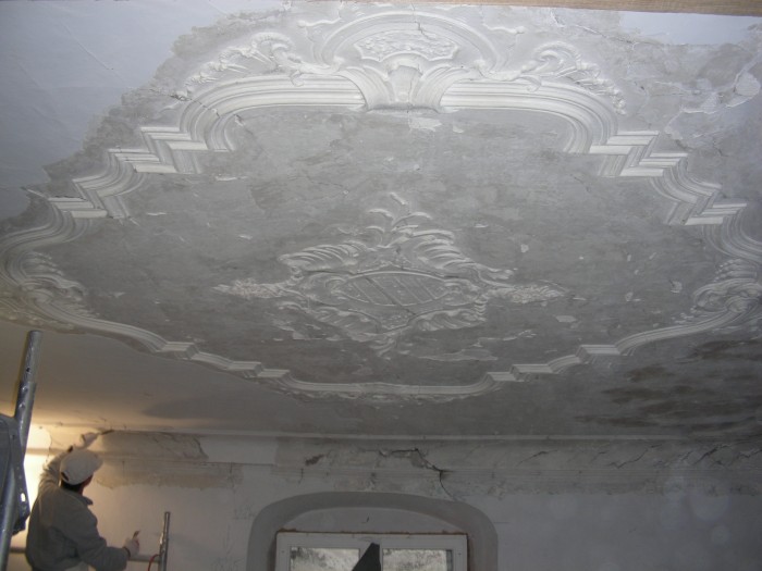 ... sieht die Decke im 1.OG des alten Museumsgebäudes gleich ganz anders aus. Sie wird im Zukunft bestimmt die Blicke der Besucher auf sich ziehen. In der Mitte des Stuckornamentes kam ein Wappen zum Vorschein.