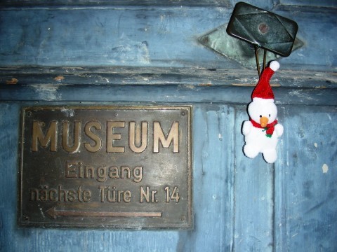 ... haben wir im Kaisergäßchen im Dezember. Im Inneren laufen schon die ersten Heizungsrohre warm, so dass dort auch in der kalten Jahreszeit gearbeitet werden kann. Wenn es so weiter schneit, kann man vielleicht bald echte Schneemänner im Hof bauen. Bis dahin wünscht dieses Exemplar aus Plüsch: Frohe Weihnachten.
