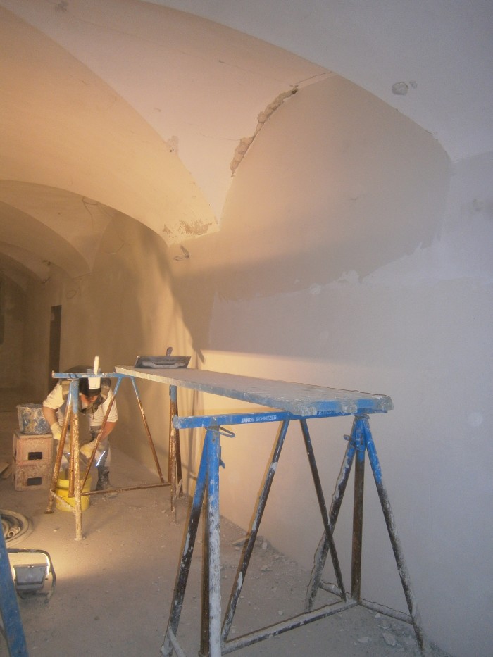 April 2011: Damit auch im Altbau das Klima den konservatorischen Ansprüchen eines Museums genügt, bedienen wir uns der Wand-Temperierung. Dabei werden fingerdicke Heizungsrohre unter Putz in Schlaufen an der Wand entlang verlegt. (Hier zu sehen im EG, zukünftige Kruzifixausstellung)