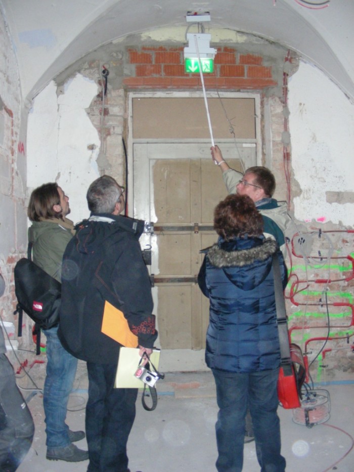 ... in den Besprechungen auf der Baustelle im Februar 2012! Natürlich müssen sicherheitsrelevante Themen wie die Fluchtwege rechtzeitig geplant werden. Hier sehen sie die Bemusterung der Fluchtwegekennzeichung durch unseren Elektrofachplaner. Beteiligte vom Architekturbüro, der Stadtverwaltung und aus dem Museum lauschen seinen Ausführungen.