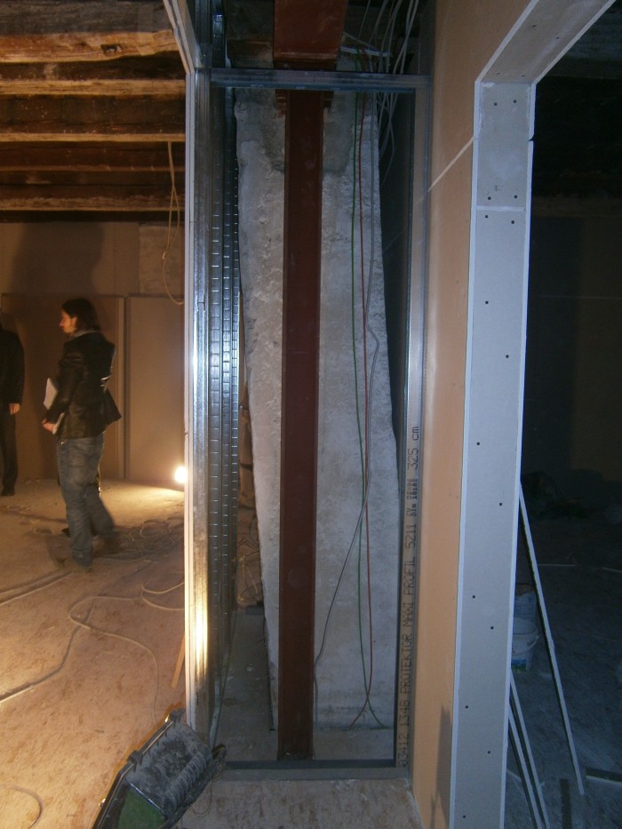 ... im März arbeiten vor allem die Trockenbauer im Museumsgebäude. Der windschiefe Kamin (hier in der Bildmitte in weiß zu sehen) des Hauses aus dem 18. Jahrhundert wird mit einer Konstruktion aus Metallstreben und Platten umbaut. So entsteht eine gerade Wand, welche die Inneneinrichtung des Museums erleichtert.