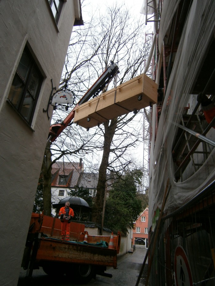 ...ist gut verpackt. In dieser Holzkiste befindet sich das erste Ausstellungsobjekt, welches bereits im April im alten Museumsgebäude aufgestellt wurde. Weil die Säule aus dem gotischen Rathaus zu groß ist, um durch das Treppenhaus getragen zu werden, mussten die Kollegen vom Bauhof mit dem Kran anrücken. Auch wenn die Aktion hier gewagt aussieht - es ging alles gut.
