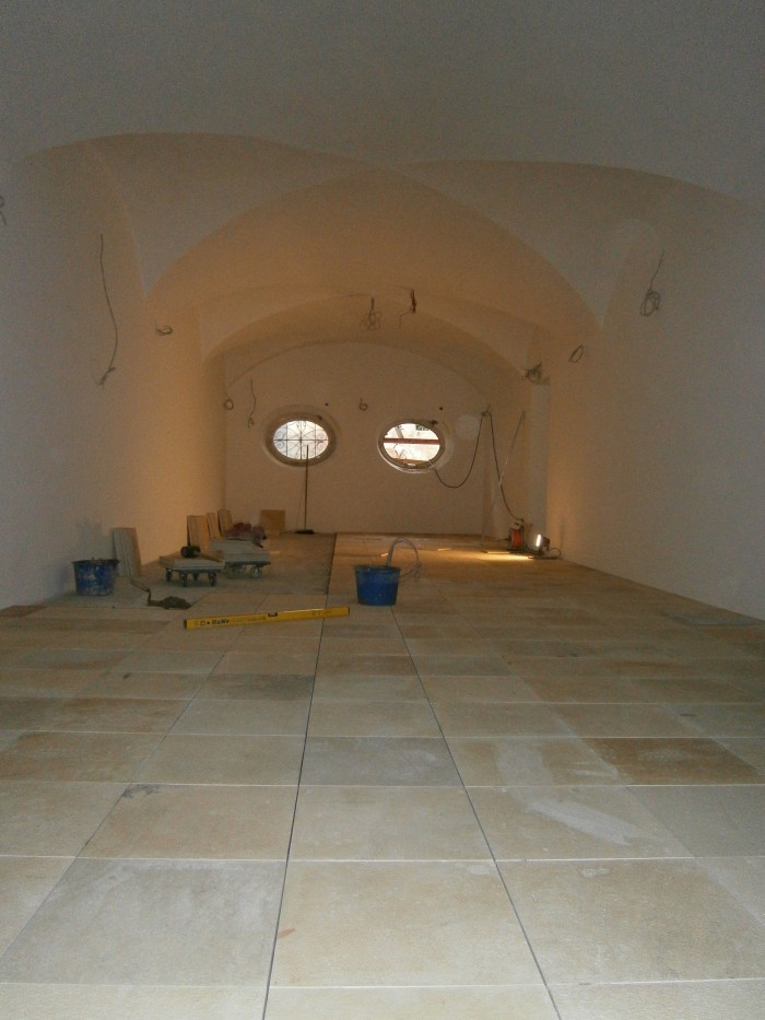 ... auch den Fußboden im Erdgeschoss des alten Museumsgebäudes. In den Gewölberäumen wird momentan der Boden aus Solnhofener Steinplatten verlegt. Wie auf dem Bild zu sehen ist passt der Kalkstein aus der Jurazeit sehr gut zur Raumstruktur und zur Kruzifixsammlung, die künftig dort präsentiert sein wird.