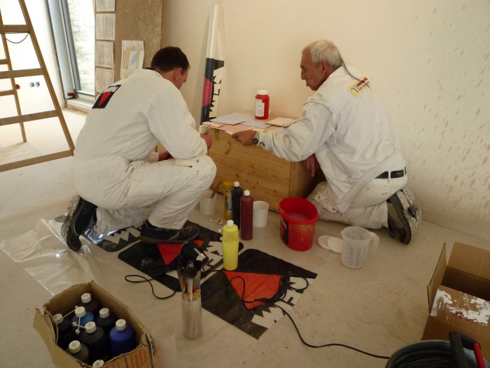... heißt es im Juni auf der Baustelle. Denn jetzt wird es konkret: die Farbmuster für die Wandfarben, die vom Museumsgestalter entworfen wurden, müssen vom Maler umgesetzt werden. Das bedeutet Farben mischen, trocknen lassen, ins Licht halten, Vergleich mit dem vorgegebenem Muster, noch ein Schuss Gelb dazu, wieder ins Licht halten...