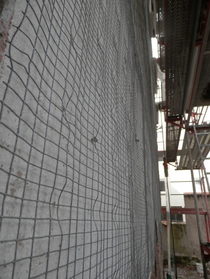 Skulptur aus Metall? Dieses Drahtgitter, das an der Fassade des Museumsgebäudes angebracht ist, hat keine schmückende sondern eine nützliche Funktion: es sorgt dafür, dass der Dämmputz am Gebäude besser haftet und die Wärmedämmung optimal unterstützt wird.