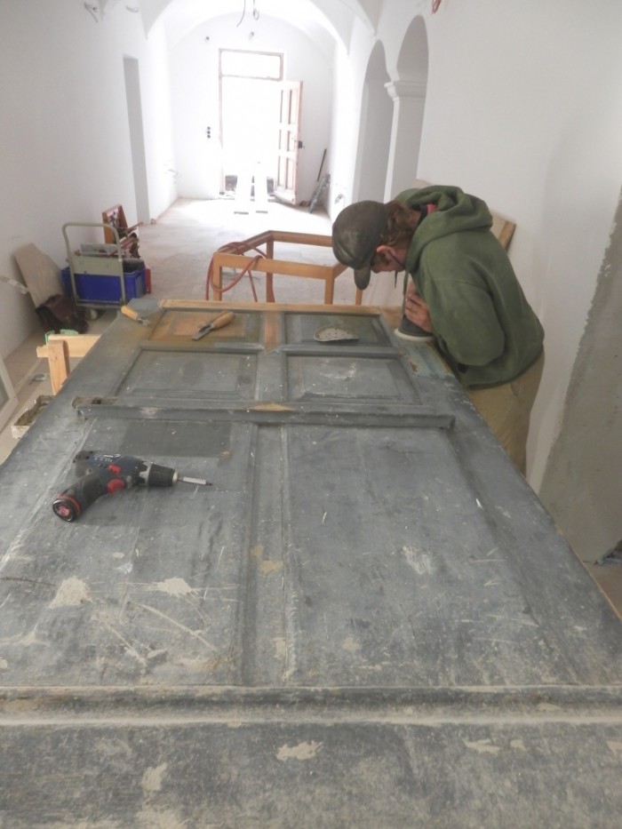 ... wurden im Juli auch die Türen des Altbaus wieder hergerichtet. Die massiven Holztüren werden hier gerade von den Farbschichten der letzten Jahrzehnte befreit. Sie bekommen anschließend einen neuen, passenden Anstrich. Die Türe auf dem Foto wird dann wieder in voller Pracht vom Kaisergäßchen aus zu sehen sein. Der Besucher allerdings betritt zukünftig nicht durch sie, sondern durch den Neubau das Museum.