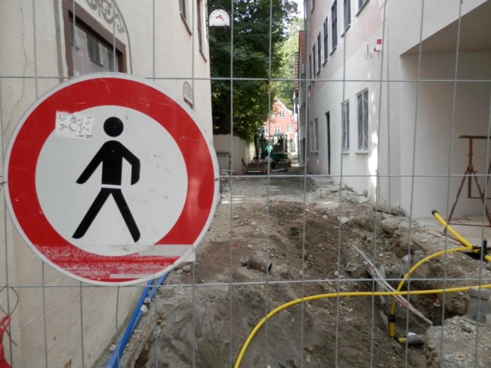 ... im Kaisergäßchen, und fast hat es den Anschein, als würde sie das frisch renovierte Museum wieder verschlingen wollen. Aber das täuscht, im Oktober 2012 findet lediglich die Sanierung des alten Kanals statt. Das führt zwar zeitweise zur Sperrung des Gäßchens, doch sind alle Beteiligten darum bemüht, die Beeinträchtigungen gering zu halten und die Straßendecke so schnell als möglich wieder zu schließen.