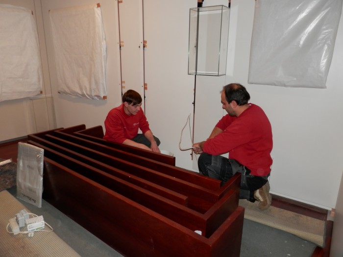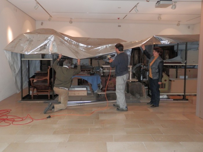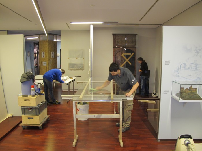 ... läuft der Innenausbau im Dezember 2012 an. Zahlreiche Hände sind nötig, um die Ausstellung entstehen zu lassen: Die Glasscheiben der Vitrinen müssen geputzt werden, eine Textilrestauratorin kümmert sich im Hintergrund um die fachmännische Montage einer Fahne, und der Apothekerschrank wird noch einmal inspiziert, bevor die raumhohe Vitrine geschlossen wird.
