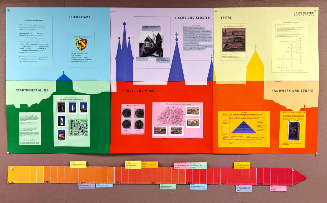 Mit dem Museumskoffer reist die Klasse in die mittelalterliche Reichsstadt Kaufbeuren. Dabei bearbeiten die Schüler und Schülerinnen, eingeteilt in sechs Gruppen, verschiedene Aufgaben eines Themenbereichs (Reichsstadt, Stadtbefestigung, Handwerk und Zünfte, Kirche und Kloster, Spital, Handel und Markt) und setzen sich so auf spannende und aktive Weise mit der Kaufbeurer Stadtgeschichte auseinander. Jede Gruppe erhält außerdem eine gestalterische Aufgabe. Aus den Arbeitsergebnissen der Schulkinder entsteht nach und nach ein Wandbild für's Klassenzimmer.